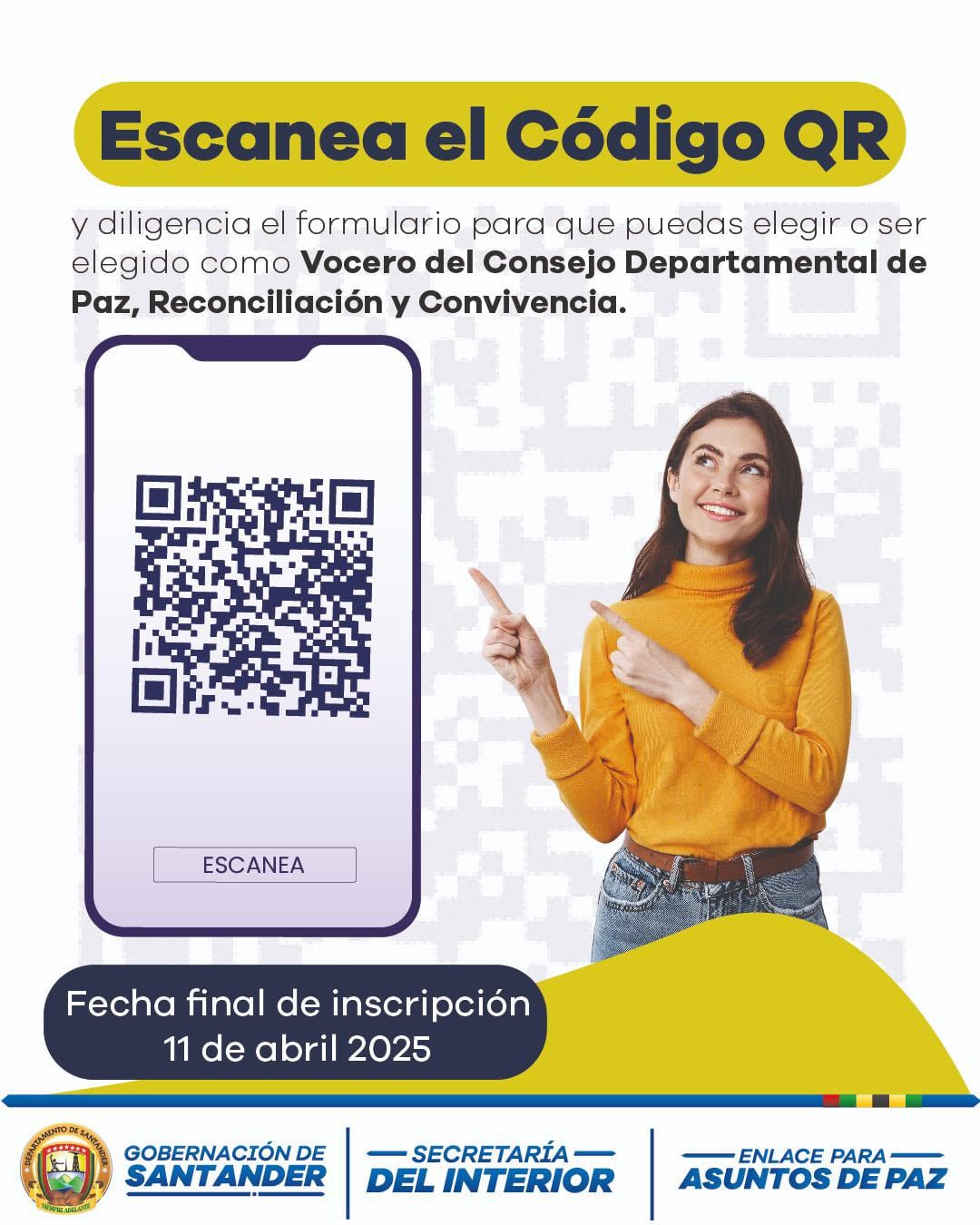 Hasta este viernes 11 de abril estará abierta la convocatoria para postularse como vocero del Consejo Departamental de Paz, Reconciliación y Convivencia, una instancia que promueve la construcción de paz con participación ciudadana en Santander.