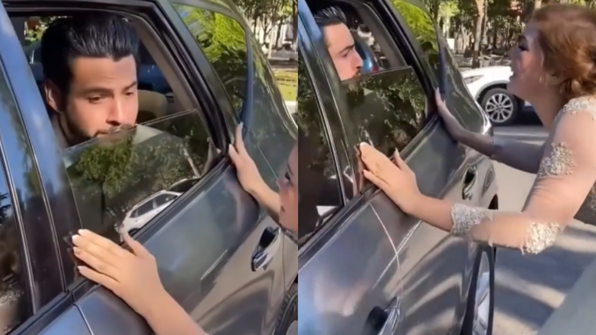 La mujer, vestida de novia llora desconsoladamente al percatarse que su novio se encuentra dentro del vehículo en compañía de una de sus primas, y en respuesta intenta dar algunas “explicaciones”, sin embargo, cuando llega el hermano de la novia a reclamarle por la situación, este sube el vidrio para impedir algún tipo de agresión.