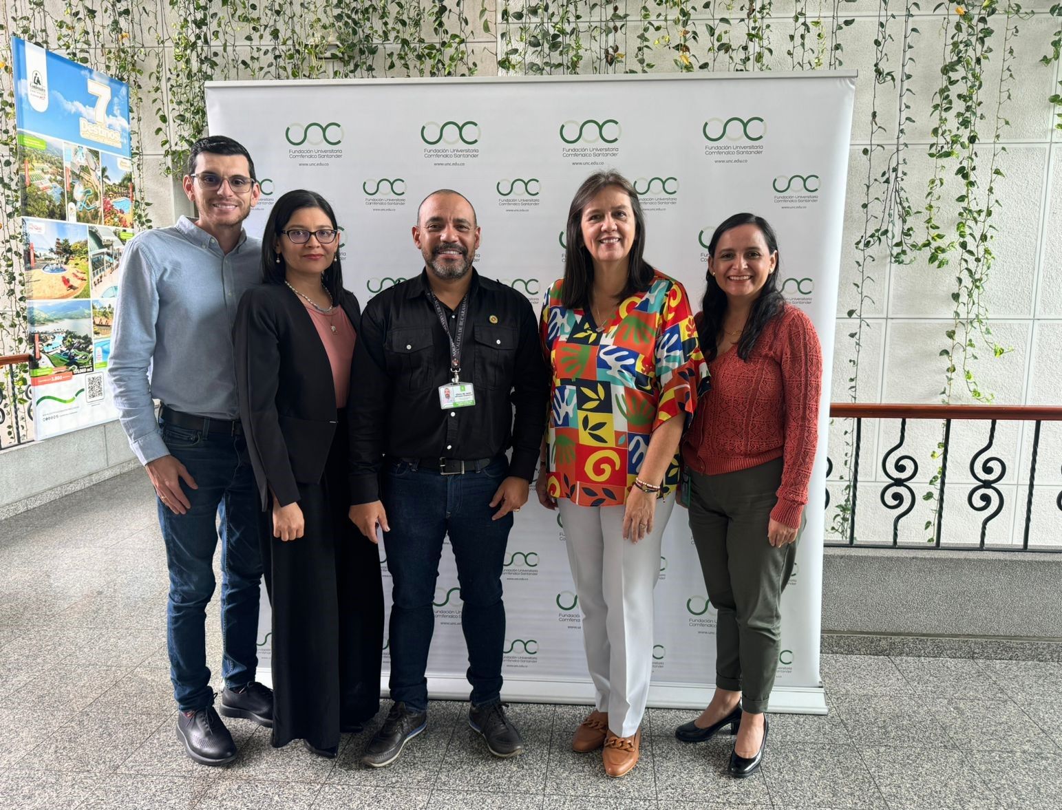 En la gráfica: Carlos Manuel Valbuena Téllez, profesional de apoyo de Proyección Social – UNC; Sonia Liseth Peñaloza Bohórquez, coordinadora de la Tecnología en Gestión Turística y Desarrollo Local – UNC; Olinto Africano Chamorro, Líder del Programa de Educación Superior de la Alcaldía de Bucaramanga; Carmen Cecilia Quintero Lozano, rectora de la UNC y Claudia Milena Malaver Moreno, coordinadora académica – UNC.