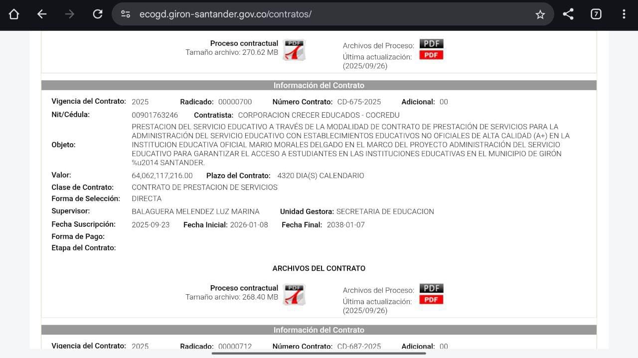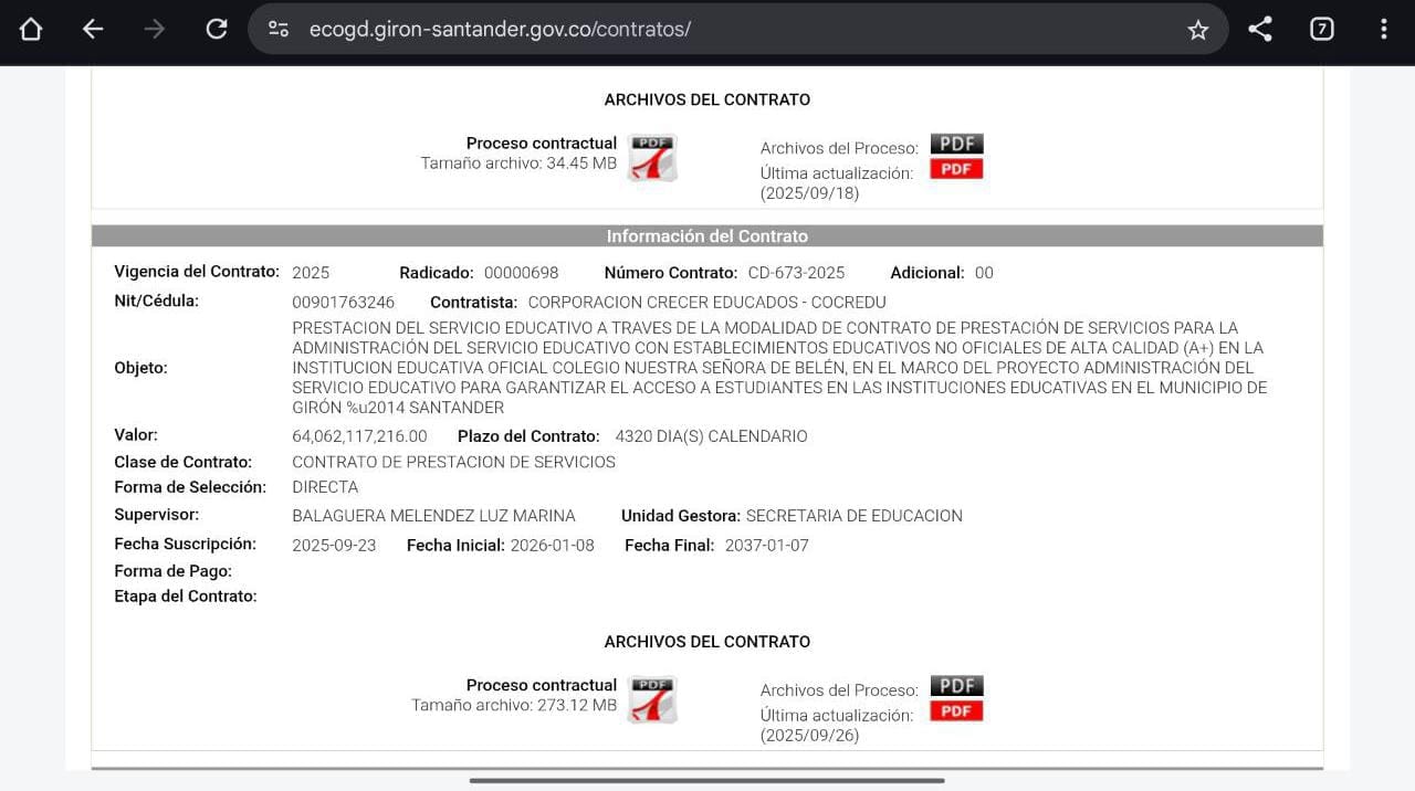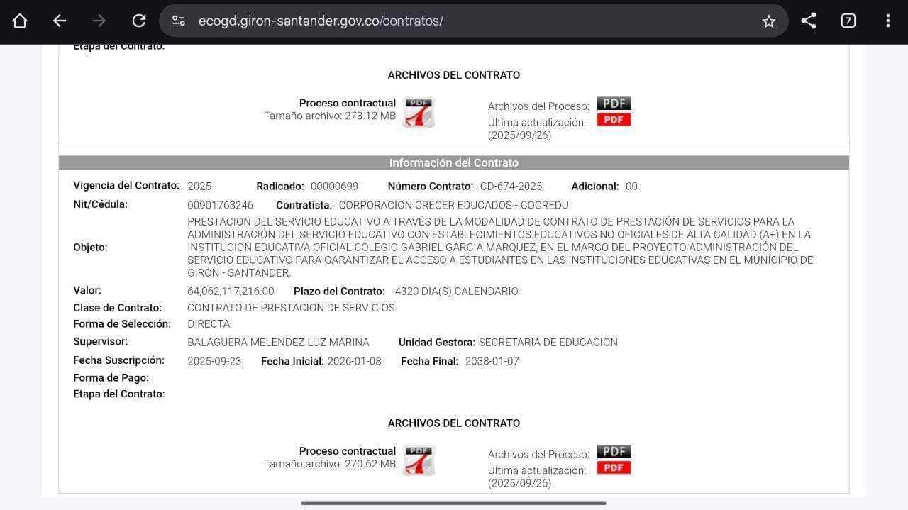 Tres días antes de que el Consejo de Estado confirmara la nulidad de su elección, el Alcalde de Girón, Campo Elías Ramírez, firmó el contrato 698 del 23 de septiembre de 2025 que compromete vigencias futuras del municipio por doce años para la administración de servicios educativos en tres instituciones, por 64.062.117.216 de pesos.