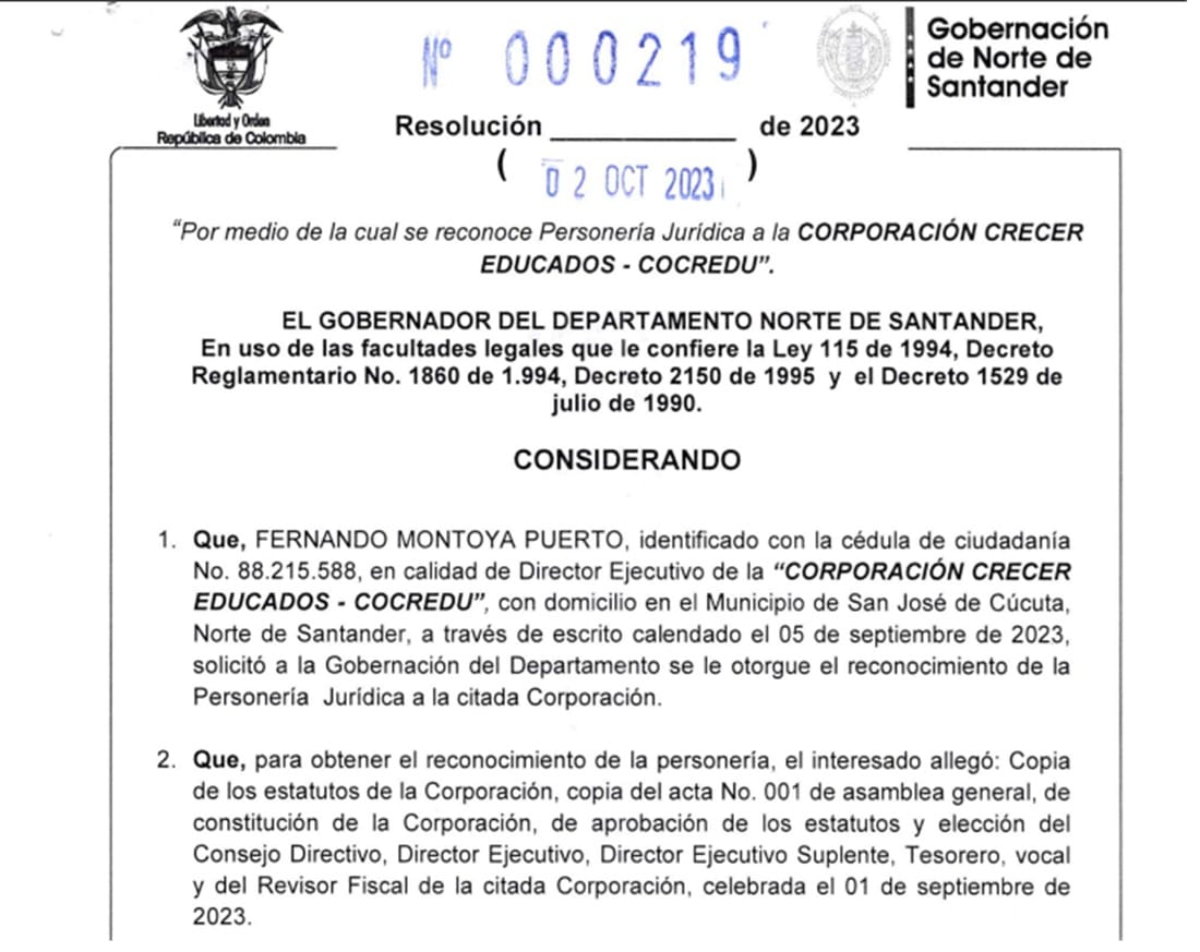 Según el acta de constitución, Fernando Montoya Puerto figura como director ejecutivo y representante legal. La documentación indica que la entidad tiene domicilio en San José de Cúcuta y que su junta directiva quedó inscrita conforme a la norma.