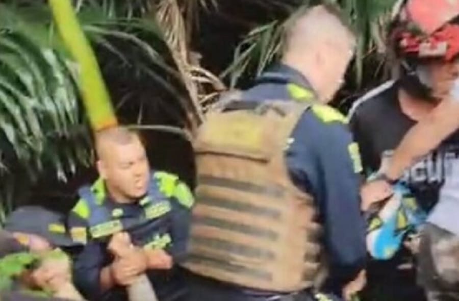 En imágenes difundidas en redes sociales, se observa cómo uniformados, junto con personal de seguridad privada, trasladaron al herido desde la zona boscosa hasta una vía cercana, donde una mujer intentó reanimarlo.