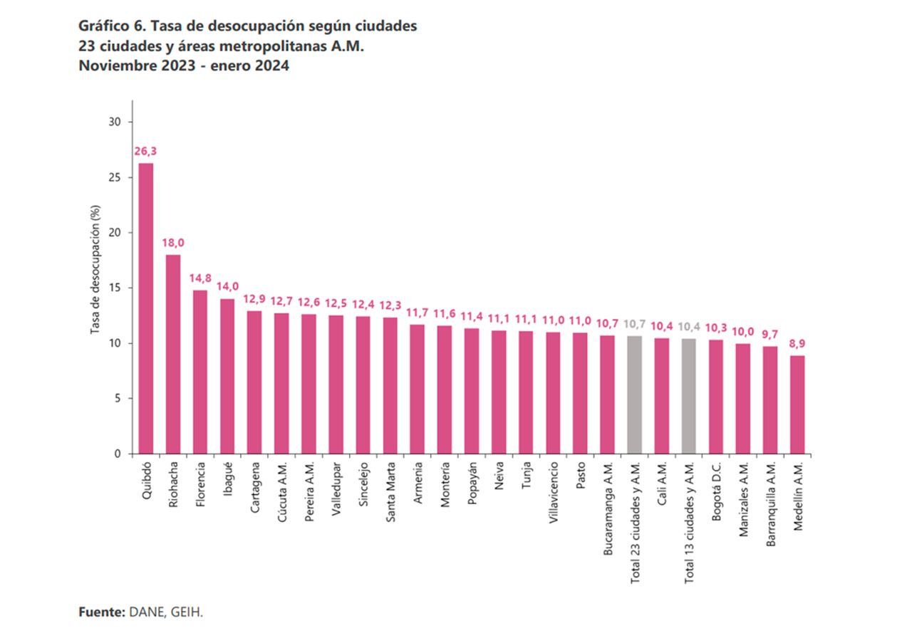 El desempleo en las 13 principales ciudades y áreas metropolitanas de Colombia disminuyó a 12,4% en enero 2024, una disminución de 2,1 puntos porcentuales respecto al mismo período de 2023. Bucaramanga ahora es quinta en desempleo, mientras que Medellín es la primera con 8,9%.