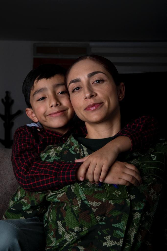 El equilibrio entre su vocación militar y su rol de madre surge como elemento distintivo de su historia. Emilio, su hijo de ocho años, acompaña a su madre en despliegues y cambios de residencia.