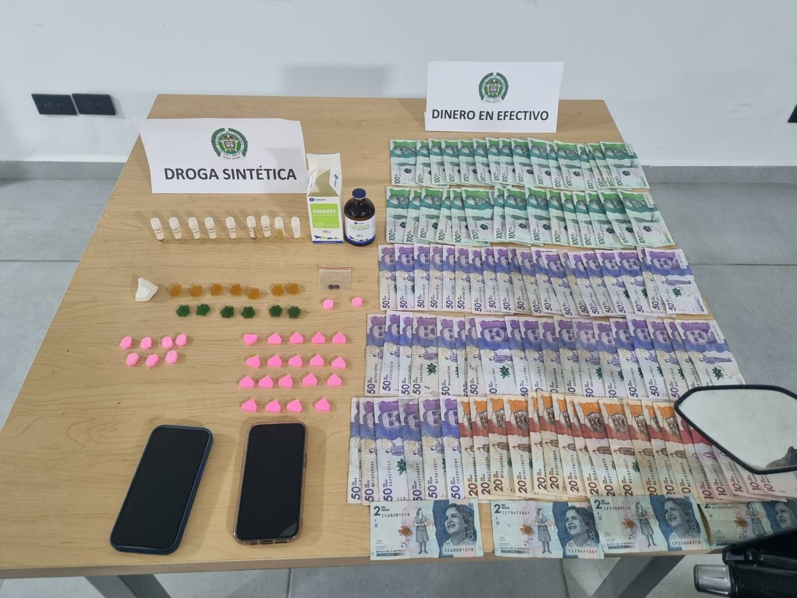 En medio del registro, las autoridades encontraron varias sustancias ilegales listas para su distribución, entre ellas derivados similares al bazuco, dosis líquidas que se asemejan al éxtasis y diferentes presentaciones de droga sintética tipo tusi, como pastillas y gomas. También fueron incautados elementos utilizados para la dosificación y venta.