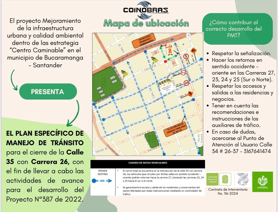 Uno de los puntos más críticos será la intersección de la calle 35 entre carreras 26 y 27, donde se aplicará un cierre total. La medida obligará a los vehículos que se movilizan en sentido occidente-oriente a tomar rutas alternas utilizando las carreras 23, 24 y 25, hacia el norte o el sur.
