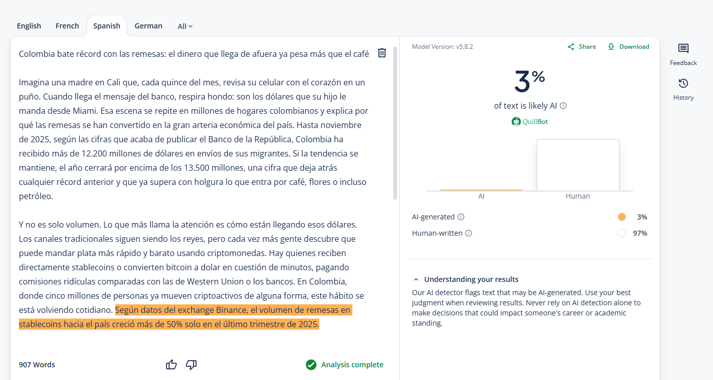 Y no es solo volumen. Lo que más llama la atención es cómo están llegando esos dólares. Los canales tradicionales siguen siendo los reyes, pero cada vez más gente descubre que puede mandar plata más rápido y barato usando criptomonedas. Hay quienes reciben directamente stablecoins o convierten bitcoin a dolar en cuestión de minutos, pagando comisiones ridículas comparadas con las de Western Union o los bancos. En Colombia, donde cinco millones de personas ya mueven criptoactivos de alguna forma, este hábito se está volviendo cotidiano. Según datos del exchange Binance, el volumen de remesas en stablecoins hacia el país creció más de 50% solo en el último trimestre de 2025.