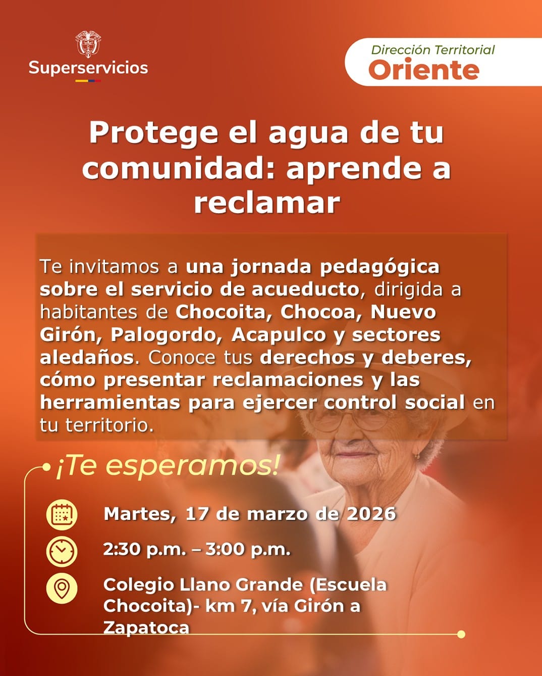 Generado por Inteliegenica Artifical (OpenAI)La Superintendencia de Servicios Públicos Domiciliarios - Dirección Territorial Oriente invita a los habitantes de Chocoita, Chocoa, Nuevo Girón, Palogordo, Acapulco y sectores aledaños a una Jornada Pedagógica sobre el servicio de acueducto y una Mesa de Trabajo con Aqualia y Piedecuestana de Servicios.
