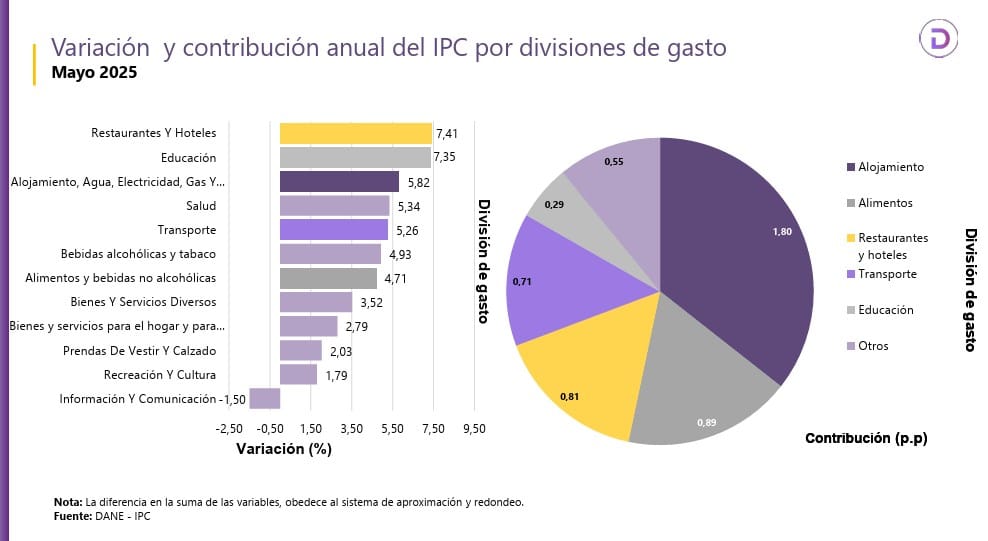 Andrea Ramírez Pisco, subdirectora del Dane, explicó que el comportamiento de la inflación en mayo se explica por las divisiones Alimentos y bebidas no alcohólicas (0,6 %) y Alojamiento, agua, electricidad, gas y otros combustibles (0,48%).