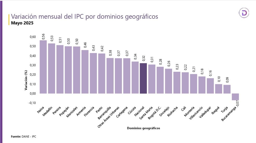 El informe del Dane señala que las ciudades que estuvieron por encima del promedio nacional de IPC para mayo de 2025 (0,32 %) fueron: Neiva con 0,56 %. Le siguen Medellín (0,53 %); Pereira (0,51 %) y Popayán y Manizales (0,5 %), principalmente.