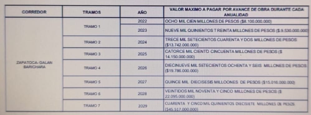 De acuerdo con los documentos de la contratación oficial la obra, identificada con el No. CO1.PCCNTR .4316863, fue firmada en el 2023 con un costo de 147 mil 935 millones 980 mil pesos y su ejecución fue otorgada por la Gobernación de Santander, bajo el compromiso de vigencias futuras, a la empresa Contratista Consorcio Constructor Gm Santander, con una interventoría contratada por el Invias por un costo de 27 mil millones de pesos a cargo de la firma Consorcio Vías Conexión AC, para un total de 171 mil 206 millones de pesos.