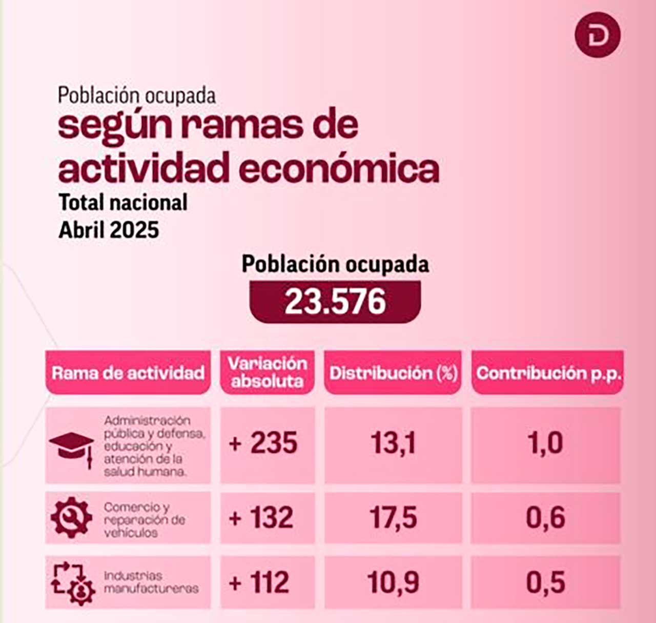 El Dane informó que en abril pasado, de los 711 mil nuevos ocupados, el grupo Administración pública y defensa, educación y atención de la salud humana aportó 235 mil puestos de trabajo; Comercio y reparación de vehículos, 132 mil; Industrias manufactureras, 112 mil; y Transporte 106 mil, entre las principales. Otros aportes fueron Alojamiento y servicios (81 mil); Información y comunicaciones (62 mil), y Actividades inmobiliarias (55 mil).