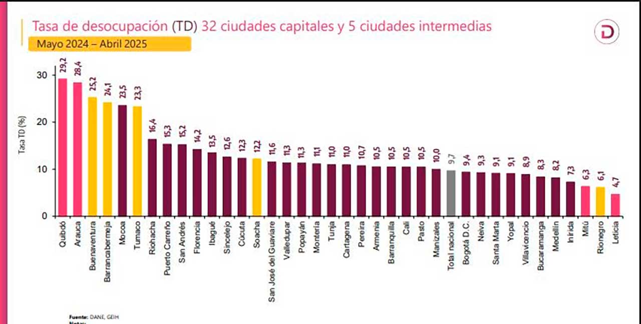 El informe del Dane muestra que mientras el promedio nacional de la Tasa de Desocupación llegó a 9,7 % en abril, Quibdó tuvo una tasa de desempleo de 29,2 %, seguida de Arauca (28,4 %) y Buenaventura con (25,2 %).