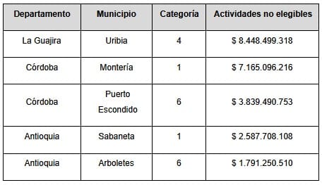 En el año 2024 se ejecutaron $103.932 millones del componente de agua potable y saneamiento básico en actividades no elegibles. Los municipios con mayor participación en estos gastos irregulares fueron Uribia, Montería, Puerto Escondido, Sabaneta y Arboletes, como se detalla a continuación: