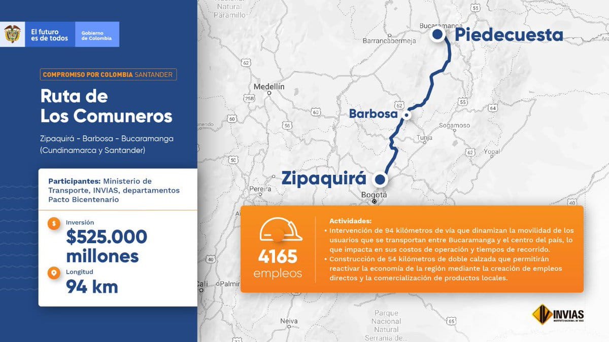 Una de las obras más importantes que se beneficiará en este paquete de inversiones se encuentra en el departamento de Santander donde de hace dos años se encuentra la megaobra denominada Ruta de Los Comuneros, un corredor vial que se prometió a los santandereanos para beneficiar el corredor vial Zipaquirá – Bucaramanga – San Alberto, para la cual se constituyó un convenio interinstitucional para traer a valor presente el recaudo de seis peajes existentes a lo largo de este trazado vehicular, convenio que desde su estructuración, a finales del 2024, prometió priorizar proyectos e inversiones para departamentos como Cesar, Santander y Boyacá, inclusive Norte de Santander y Cundinamarca.