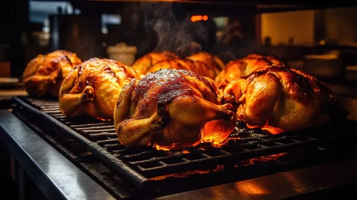 El pollo, que pesa entre 1.500 y 1.600 gramos en su estado crudo, se hornea durante 50 minutos antes de ser expuesto en vitrinas que mantienen una temperatura superior a los 60 grados Celsius.