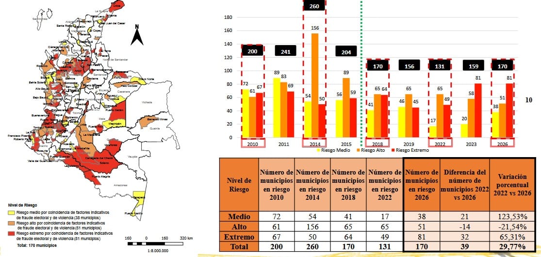 El estudio destaca que, mientras en las elecciones nacionales de 2022 se registraron 131 municipios en riesgo por coincidencia de factores indicativos de fraude y violencia, para 2026 la cifra se elevó a 170, lo que representa un incremento del 29,7 %. El dato que más llama la atención es el del riesgo extremo, que pasó de 49 municipios en 2022 a 81 para este año electoral, lo que se traduce en un crecimiento del 65,3 %.