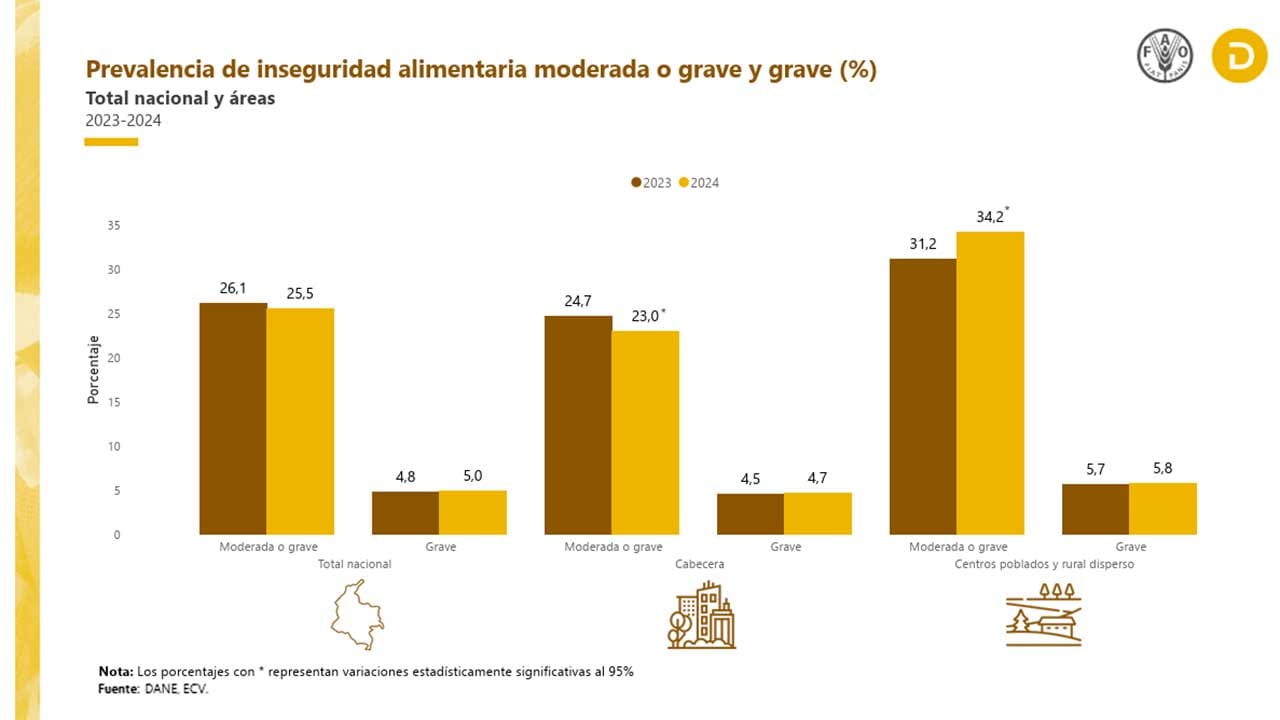 El estudio del Dane indica que en el total nacional la prevalencia de inseguridad alimentaria moderada o grave en hogares fue de 25,5 % durante 2024, con una disminución de 0,6 puntos porcentuales (p.p.) frente a 2023.