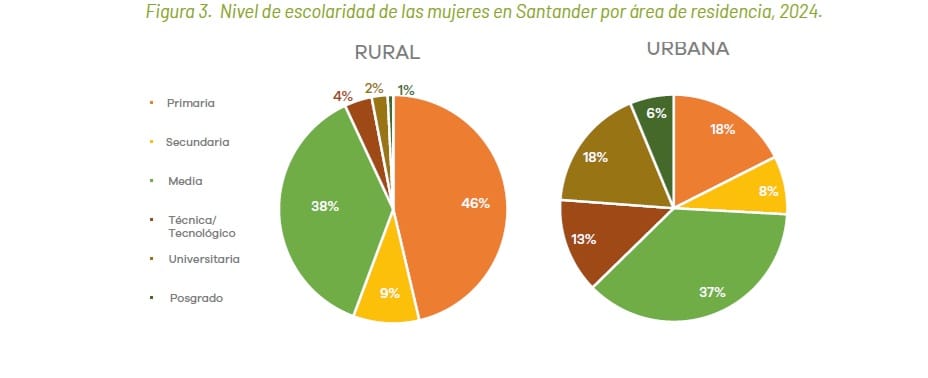 En contraste, en el área urbana se presenta un panorama más favorable, el 74% de las mujeres superan la primaria y secundaria, avanzando hacia niveles educativos más altos como la media, la técnica, la tecnológica, la universitaria o el posgrado. Cerca de 20 de cada 100 mujeres terminan la universidad y el 6% de todas las mujeres ubicadas en el área urbana de Santander alcanzan su posgrado.