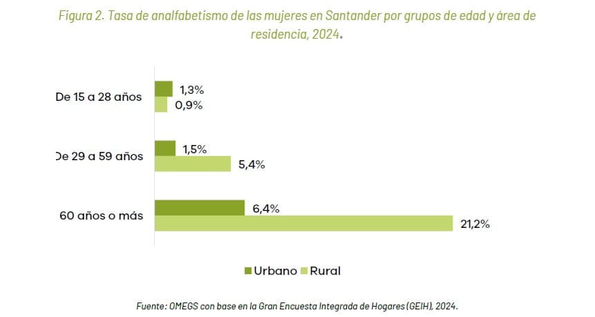 Según reveló el Observatorio de Mujeres, Equidad de Género y Sociedad (OMEGS) a través del boletín Género y territorio: brechas educativas de las mujeres rurales en Santander realizado por la Universidad Industrial de Santander en alianza con la Gobernación de Santander, para el 2022, 9 de cada 100 mujeres mayores de 15 años que viven en el campo, no sabían leer ni escribir, frente al 2,7 % de la población que vive en áreas urbana. Santander también registra un comportamiento marcado.