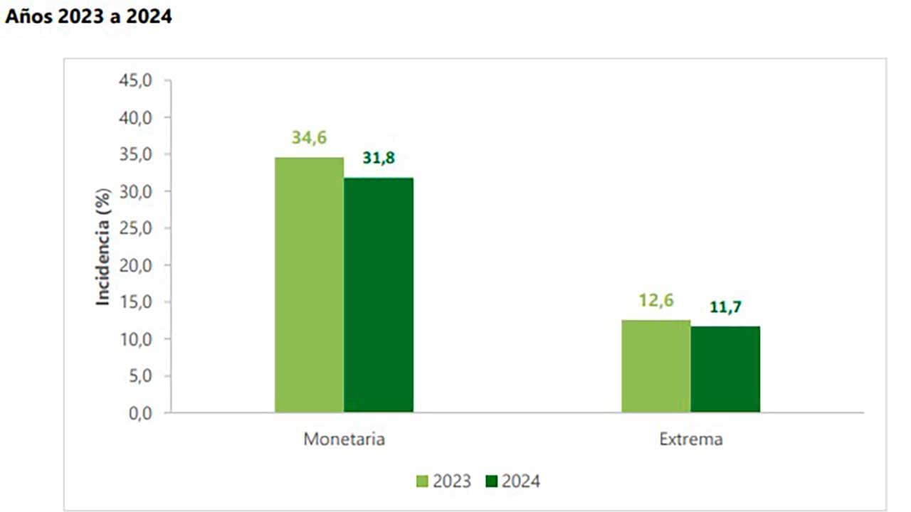 El informe señala que el año pasado la incidencia de la pobreza monetaria fue de 31,8%, es decir, 2,8 puntos porcentuales menos que en 2023 cuando fue de 34,6%. Mientras tanto, la incidencia de la pobreza monetaria extrema llegó a 11,7%, con una reducción de 0,9 puntos porcentuales frente al año pasado cuando cerró en 12,6%.