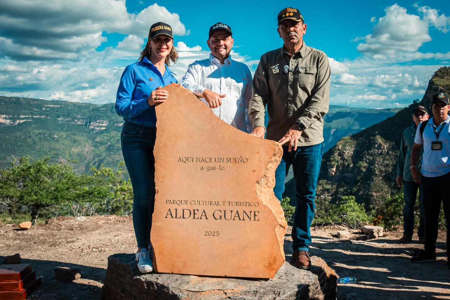 El recorrido concluyó en la Aldea Guane, donde el gobernador, acompañado de la primera dama Victoria Casallas y del alcalde de Los Santos, Diego Mendoza, colocó la primera piedra del Parque Cultural y Turístico (foto).