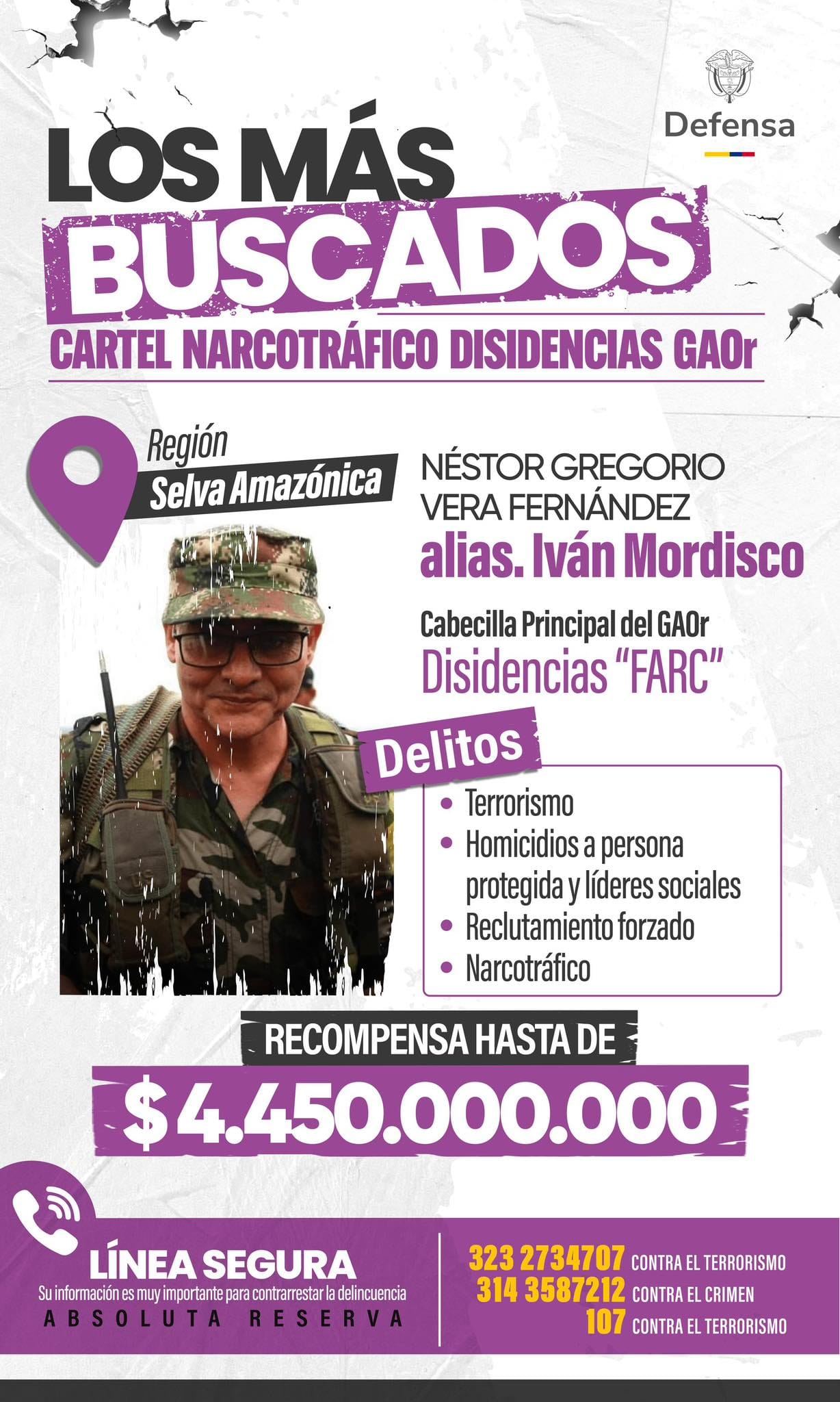 El ministro de Defensa, Pedro Sánchez, desmintió rumores sobre la muerte de 'Iván Mordisco', líder de las disidencias FARC, afirmando que sigue liderando operaciones criminales. La recompensa de 4.450 millones de pesos por su captura sigue en pie.