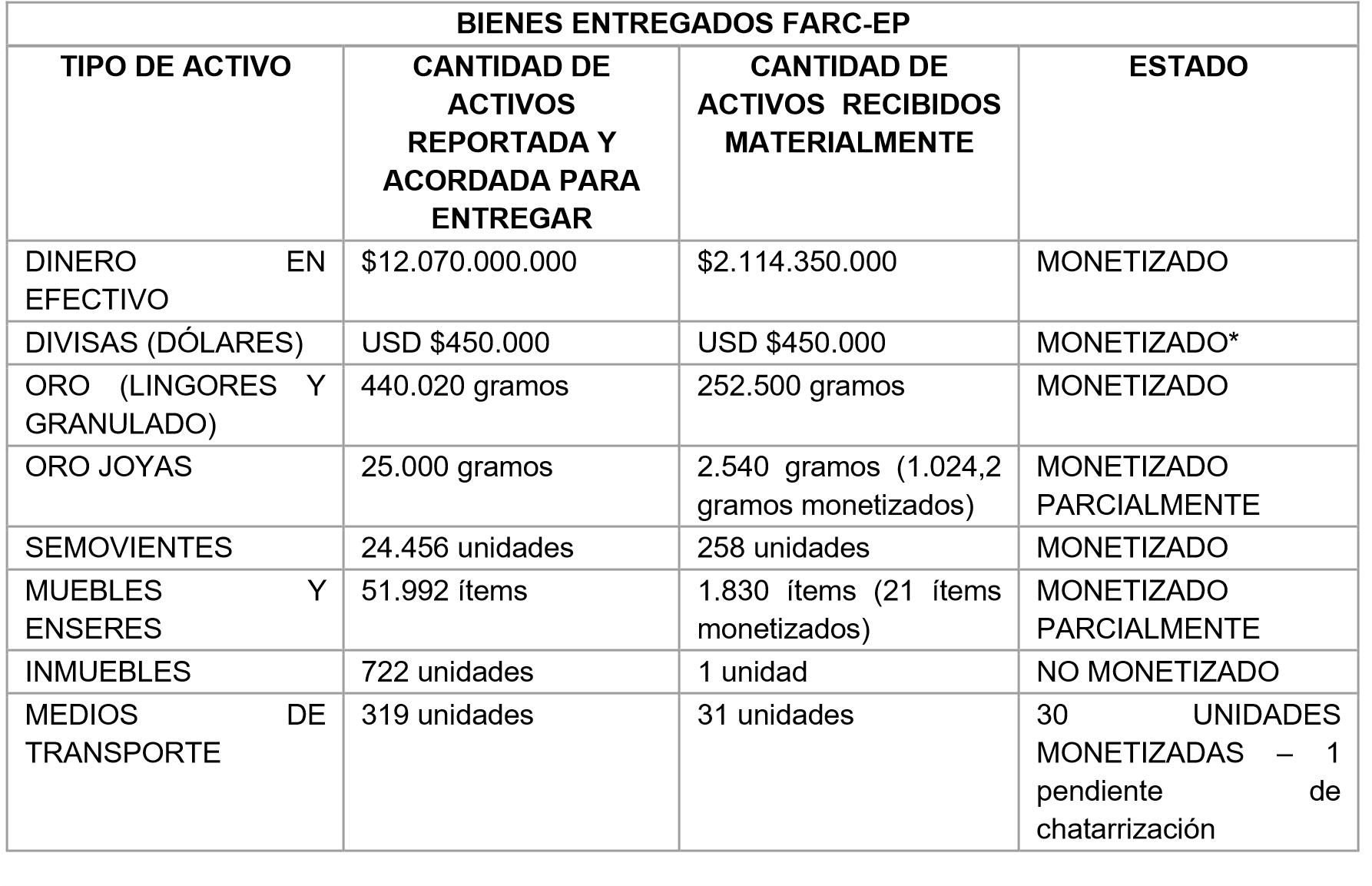 La Contraloría General de la República pudo identificar los activos que se comprometió entregar las FARC en el marco del Acuerdo de Paz con el fin de reparar a las víctimas y lo efectivamente entregado y monetizado:
