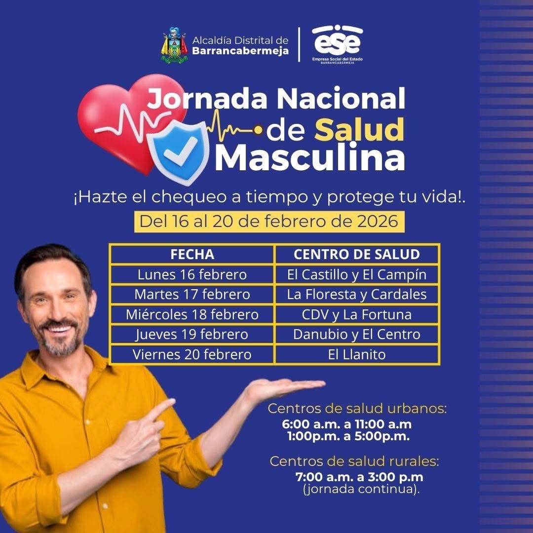 La Jornada Nacional de Salud Masculina en Barrancabermeja, organizada por la ESE y la alcaldía, pondrá especial énfasis en la detección temprana del cáncer colorrectal, ofreciendo tamizajes de riesgo cardiovascular, pruebas de PSA, y atención en salud integral para hombres del 16 al 20 de febrero.