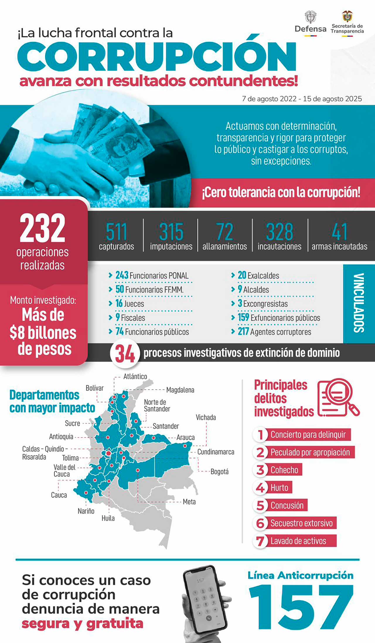 El Gobierno nacional invita a los colombianos a denunciar actos corruptos en la Línea 157, se garantiza total reserva. El Estado somos todos.