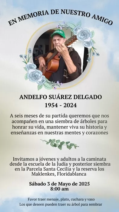 En un acto cargado de simbolismo y cariño, la vereda La Judía es escenario este sábado de un homenaje póstumo a Andelfo Suárez, tiplista, músico, gestor cultural y ambientalista que durante décadas ha defendido con pasión la naturaleza de los Cerros Orientales de Floridablanca. La actividad marca los seis meses desde su fallecimiento.