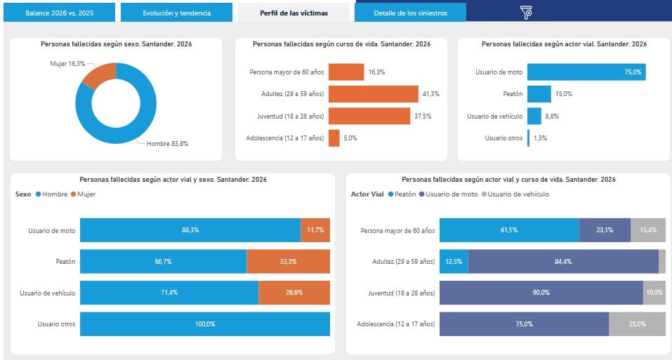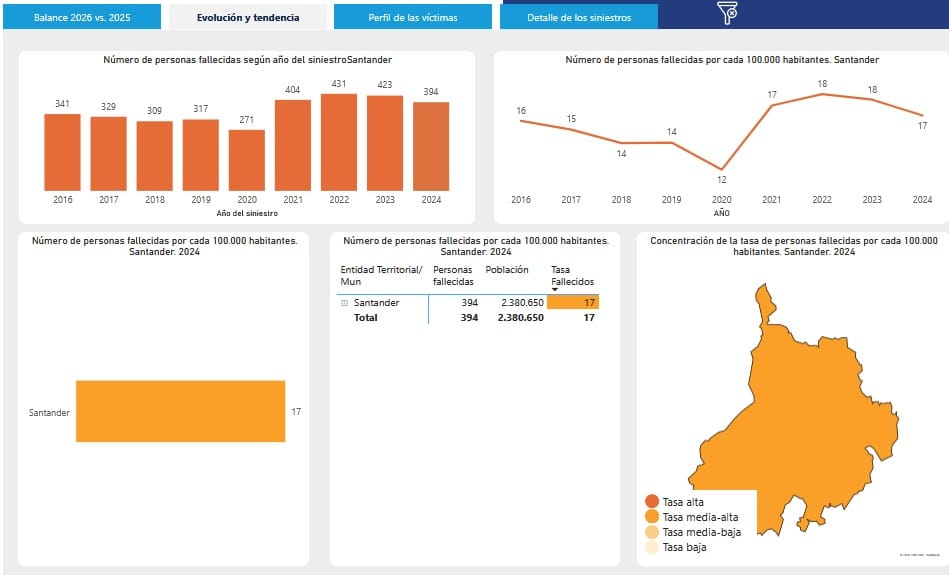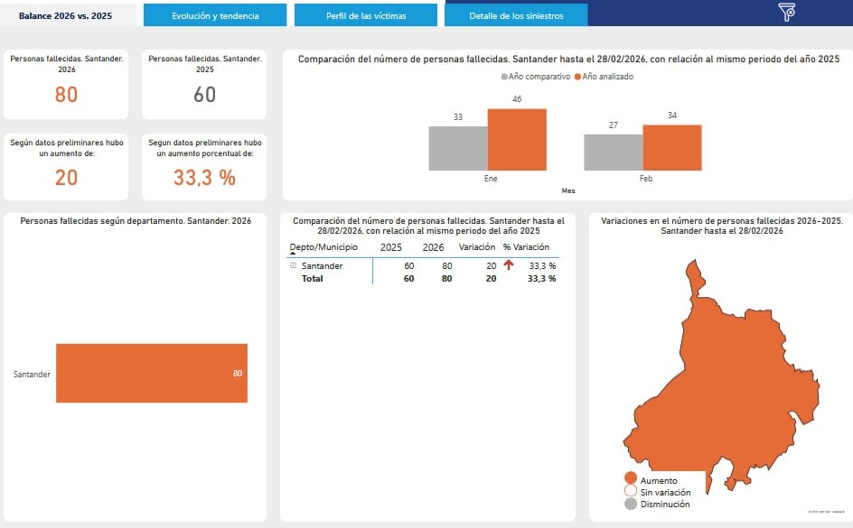 El 2026 no comenzó mejor. Entre enero y febrero, se registraron 123 muertes en la región, lo que representa un aumento del 33,7 % frente al mismo periodo del año anterior. Solo en Santander, 80 personas perdieron la vida en esos dos meses. Ochenta historias interrumpidas antes de tiempo.