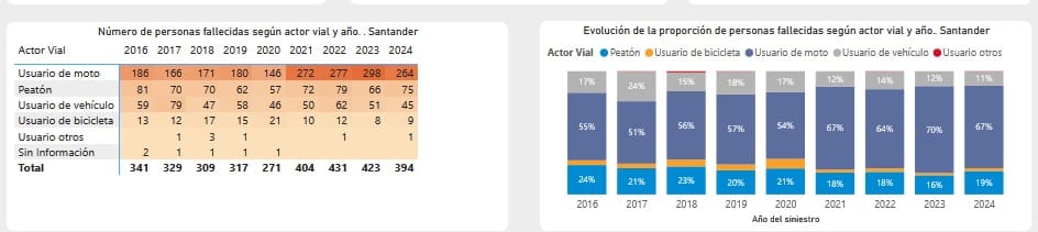 Las cifras, frías como una madrugada sin tráfico, confirman la gravedad del panorama. Según el Observatorio Nacional de Seguridad Vial, en 2025 murieron 691 personas en siniestros viales en Santander y Norte de Santander. De ellas, 416 correspondieron a Santander. La mayoría no viajaba en carro, ni en bus, ni en bicicleta: iban en motocicleta. Son, de lejos, los actores más vulnerables.