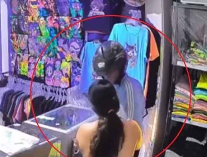 A las 9:42 de la noche, un hombre con chaqueta celeste ingresó a un local de ropa, se hizo pasar por cliente y conversó con la vendedora. Una cámara de seguridad grabó la escena.