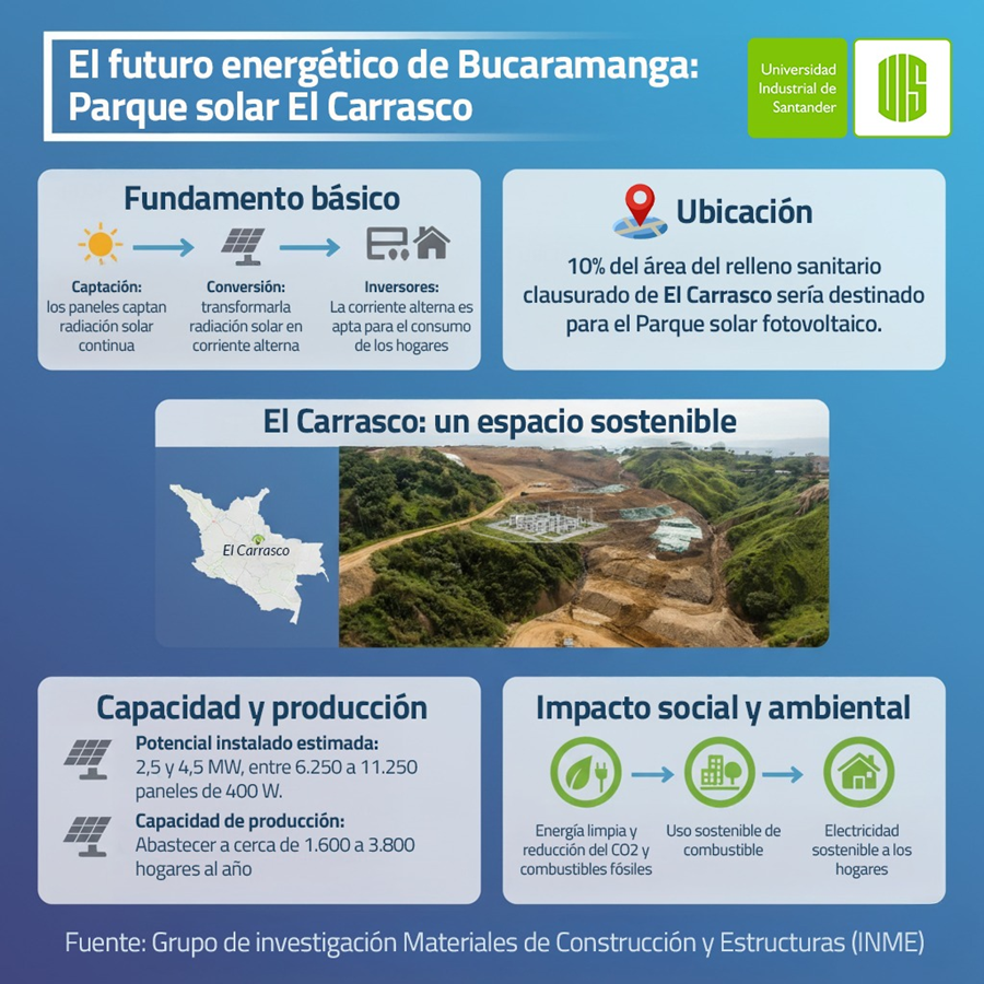 El proyecto busca transformar el relleno El Carrasco de Bucaramanga en un parque solar fotovoltaico, contribuyendo al suministro de energía limpia y reducción de pasivos ambientales. Estudiar su viabilidad económica y capacidad de conexión es esencial.