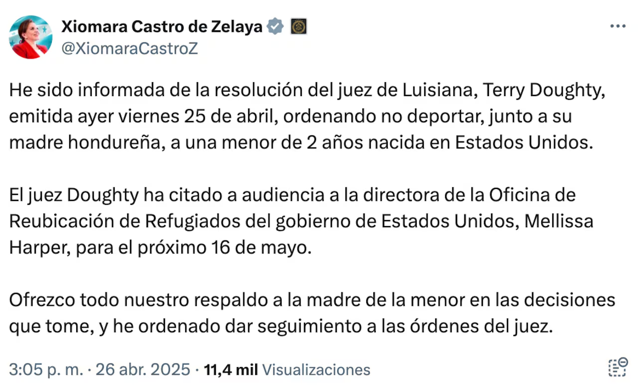 La presidenta de Honduras, Xiomara Castro, ofreció su respaldo a la madre y ordenó dar seguimiento a las órdenes del juez estadounidense. Los abogados del padre de la niña han presentado una demanda para solicitar su liberación.