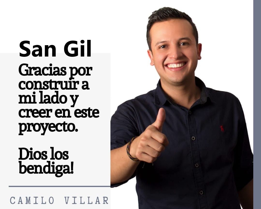 CV: Hoy gracias a unas alianzas construidas debido a una serie de coincidencias programáticas y de identidad política hemos recibido un gran apoyo del Partido Centro Democrático, movimiento que se nos ha adherido para apoyar este proyecto fortaleciendo esta candidatura, de la misma manera hemos reconocido mucho la presencia de militantes de otros partidos, incluso de simpatizantes tradicionales de otros candidatos a la alcaldía, que hoy ven en la propuesta de Camilo Villar el norte adecuado para orientar los destinos del municipio, eso es lo que nos hace fuertes y nos tiene liderando las encuestas a la alcaldía del municipio de San Gil, fuerza que con seguridad nos llevará a ganar las elecciones este 29 de octubre.