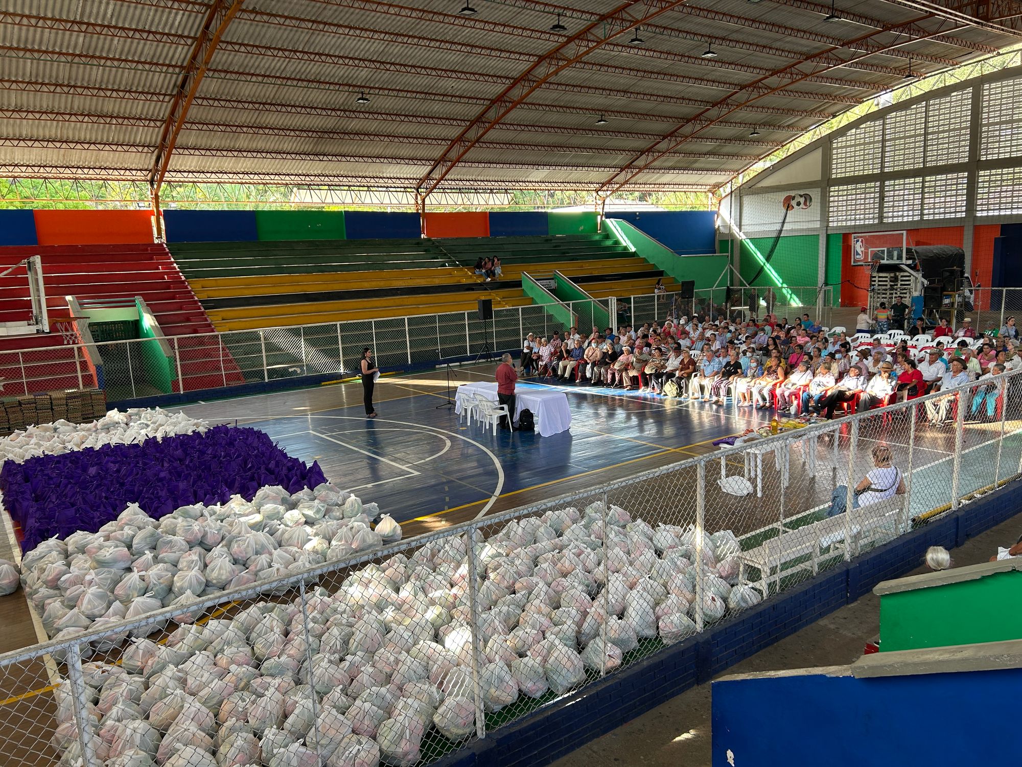 Los mercados, que fueron entregados en bolsas reutilizables de color morado, contenían productos básicos como yuca, plátano, zanahoria, aceite, huevos, arroz, azúcar, sal, tomate, papaya, harina, pasta, atún y mantequilla. Cada bolsa llevaba un mensaje grabado que resaltaba el valor de los adultos mayores: "Rescatando sonrisas en la semana del adulto mayor. Porque todos merecen ser recordados y protegidos".