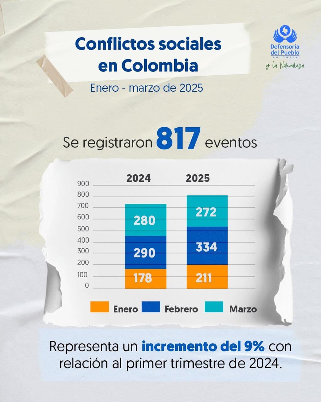 La Defensoría del Pueblo documentó 817 eventos de conflictividad social entre enero y marzo de 2025 en Colombia, un aumento del 9% respecto al mismo periodo de 2024, destacándose conflictos por derechos laborales, salud e impuestos en 276 municipios de 30 departamentos.