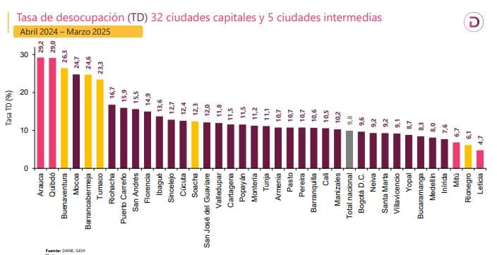 El informe del DANE también da cuenta de que por encima del promedio nacional de desocupación (9,6 %) en marzo pasado estuvieron: Arauca con 29,2 %; Quibdó 29 %, Buenaventura 26,3 %, Mocoa 24,7 %, Barrancabermeja 24,6 % y Tumaco 23,3 %, entre las que da mayor tasa de desempleo. Y las que registraron menor variación fueron Inírida 7,6 %, Mitú 6,7 %, Rionegro 6,1 % y Leticia 4,7 %.