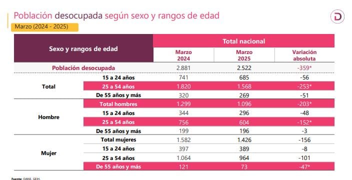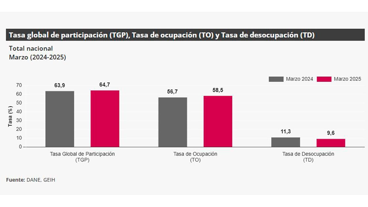 El desempleo en marzo 2025 cayó a 9,6%, con 1'057.000 nuevos ocupados. Agricultura y manufactura son sectores claves. La brecha de género en desocupación es de 9,8 p.p.