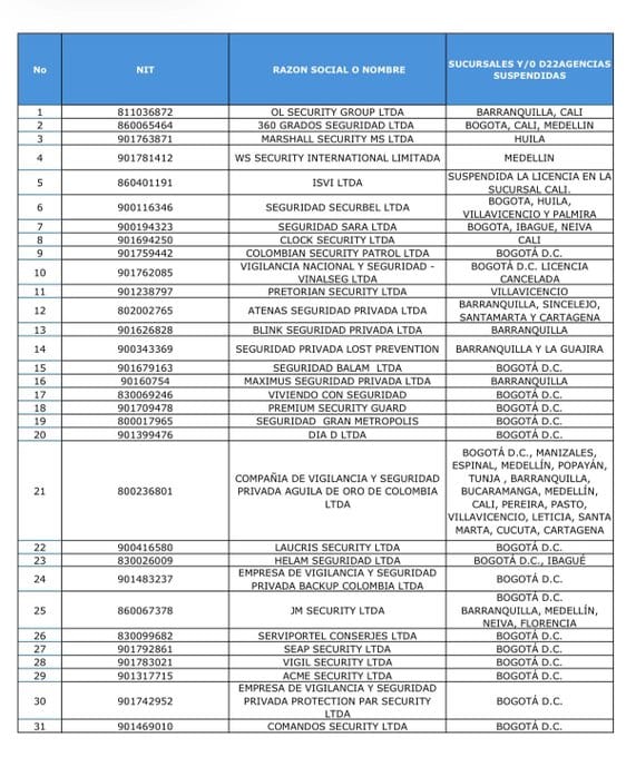 Entre las empresas suspendidas figura la Compañía de Vigilancia y Seguridad Privada Águila de Oro de Colombia, firma con presencia en múltiples ciudades del país, incluida Bucaramanga, lo que convierte el caso en un asunto de alto interés para Santander y obliga a revisar con urgencia qué conjuntos residenciales, empresas, comercios e instituciones de la región podrían estar contratando sus servicios.