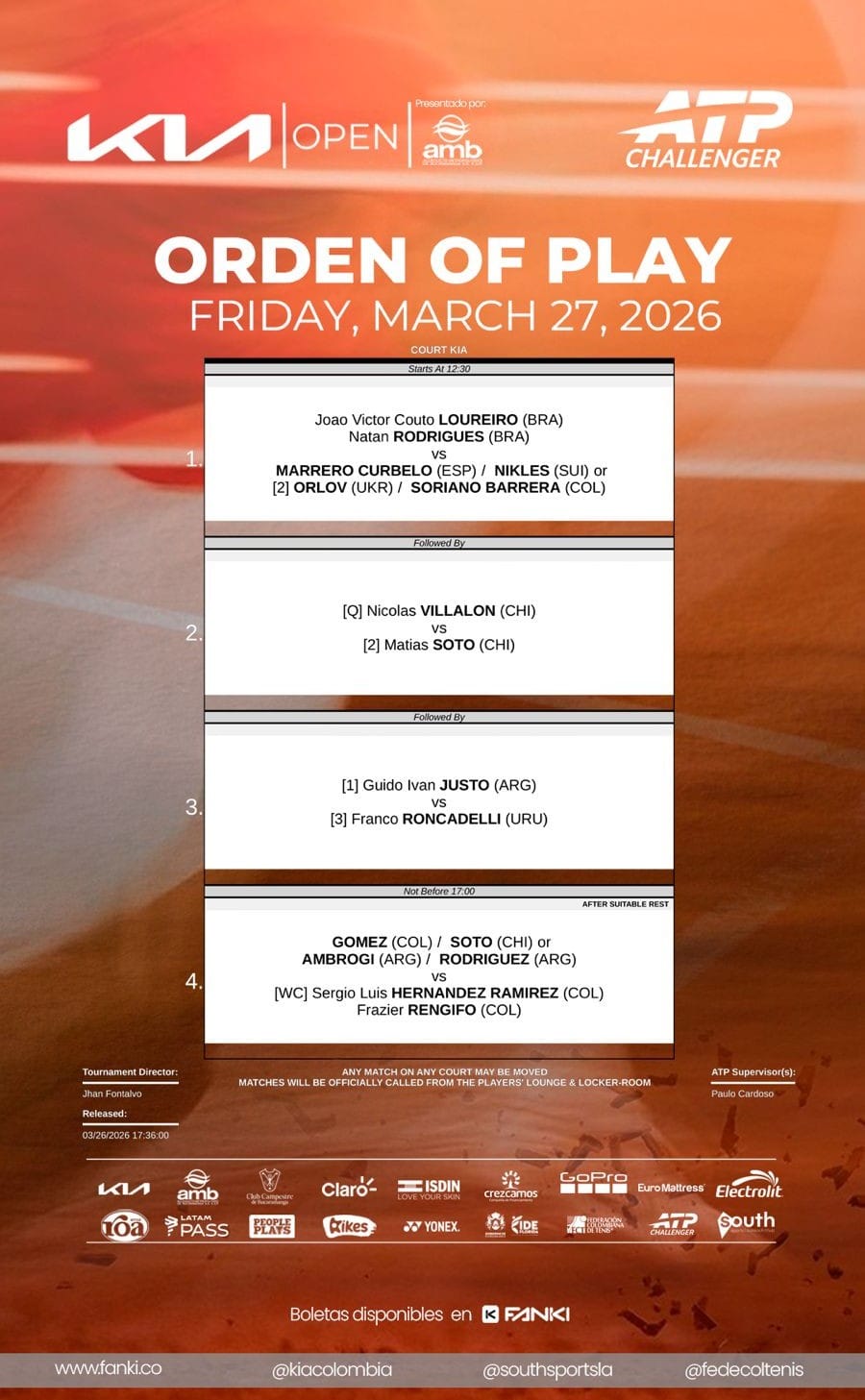 En la siguiente grafica, la programacion para la jornada de hoy viernes 27 de marzo, tanto en sencillos como en dobles.