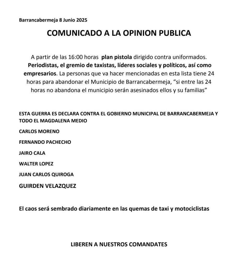Un panfleto fechado el 8 de junio de 2025 advierte un plan pistola contra uniformados, periodistas, taxistas, líderes sociales, políticos y empresarios del Distrito de Barrancabermeja, Santander.
