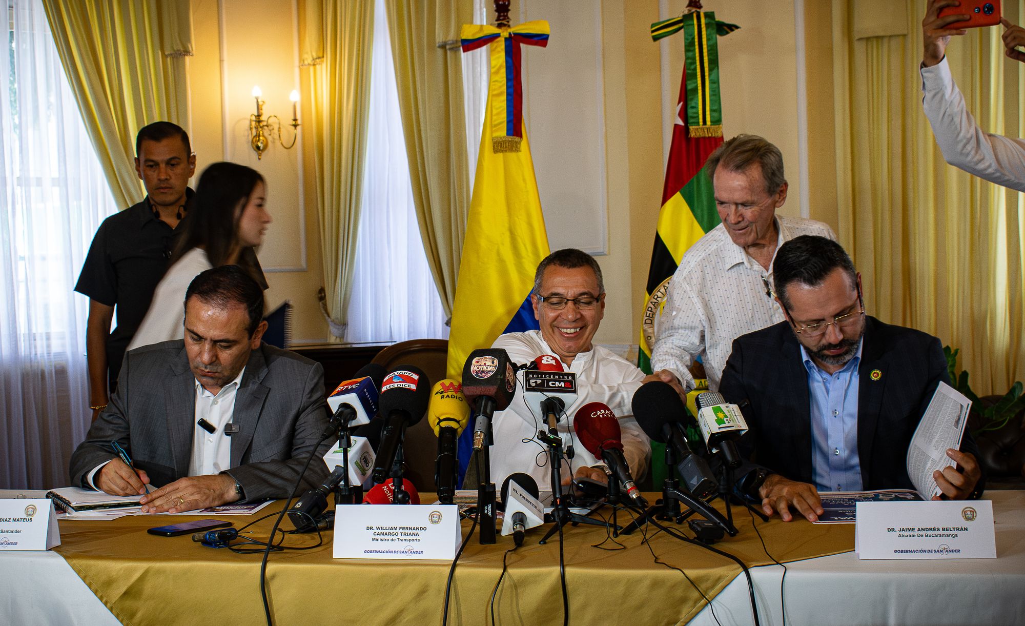 El ministro de Transporte de Colombia, William Fernando Camargo Triana, se reunió con el gobernador de Santander y alcaldes de 87 municipios para tratar el atraso en obras públicas del departamento, como proyectos viales e infraestructuras de transporte masivo.