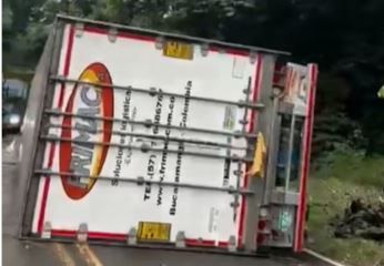 El vehículo, identificado como un Kenworth de matrícula UFV-505, quedó tendido sobre la vía, generando el cierre parcial del tránsito mientras se realizaban las labores de rescate y remoción.