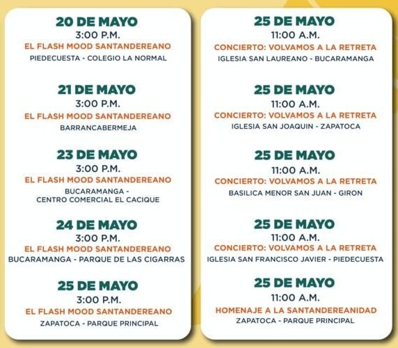 El secretario de Cultura y Turismo de Santander, Jorge Humberto Rangel Buitrago, explicó que esta actividad hace parte de una agenda departamental que continuará hasta el 31 de mayo. “Tendremos actividades en museos, ferias gastronómicas, retretas en diferentes municipios y presentaciones sorpresa en lugares emblemáticos como centros comerciales y parques. Queremos que toda la ciudadanía se sienta parte de esta conmemoración”, afirmó.