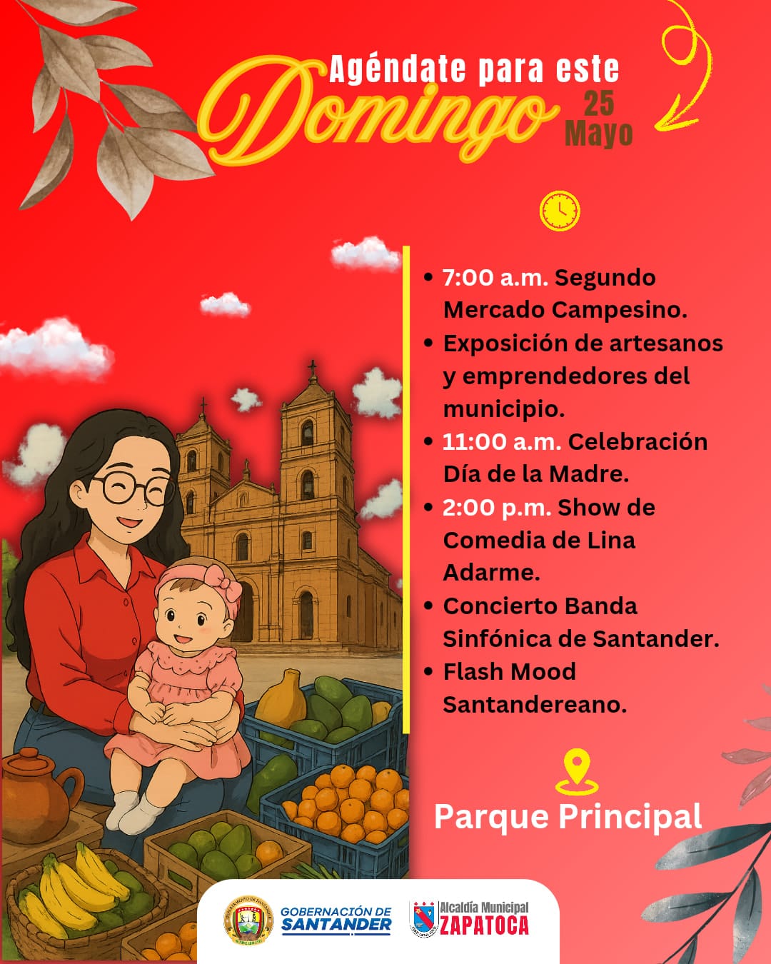 Además, los zapatocas y visitantes disfrutarán del talento de la reconocida humorista Lina Adarme, quien llevará risas y alegría con sus ocurrencias, y se realizará un homenaje especial a las madres del municipio, en el marco de la celebración del Día de la Madre.